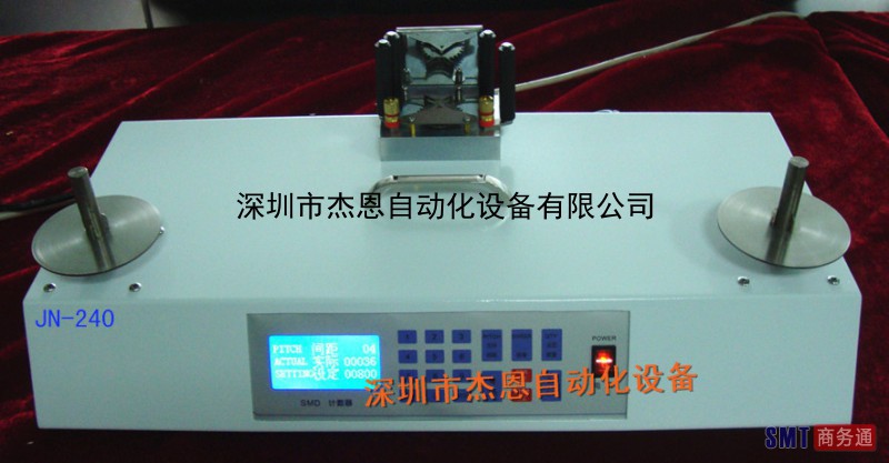 零件计数器:深圳SMD零件计数器生产厂家JN-240是指采用光电传感原理,利用零件载带引导向孔与零件的对应关系,准确测定SMD 零件数量,可实现方便快捷的计数的高效辅助设备。全自动方式计算零件数量,方便点料,发料作业以及盘点库存。运行噪音低·。 防料带脱落设计。 正反向皆可计数,可预设数量。具有液晶显示器,读取容易,操作面板中英文对照,操作简单。人性化的操作平台设计。精准度高,无计数误差。 深圳SMD零件计数器生产厂家JN-240。